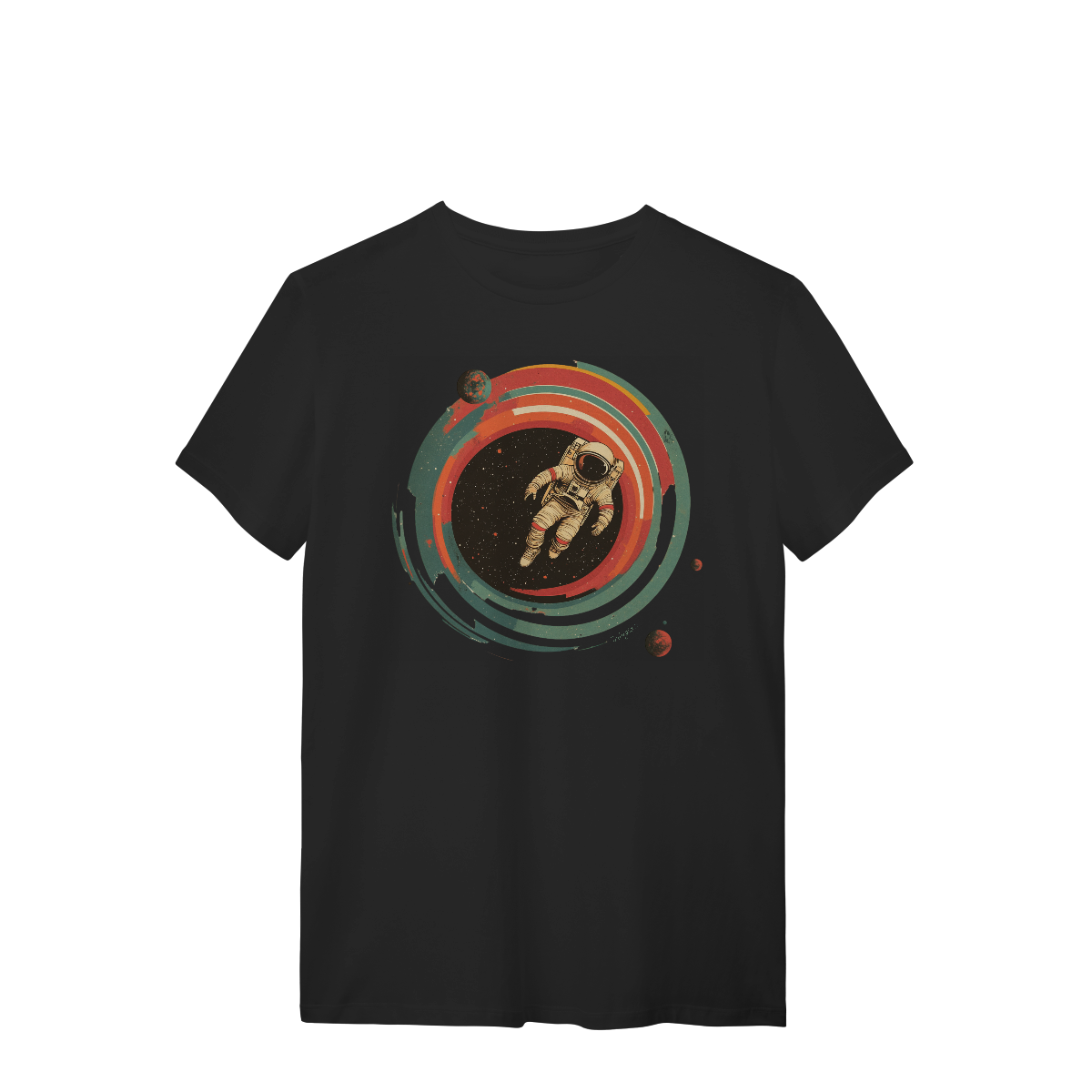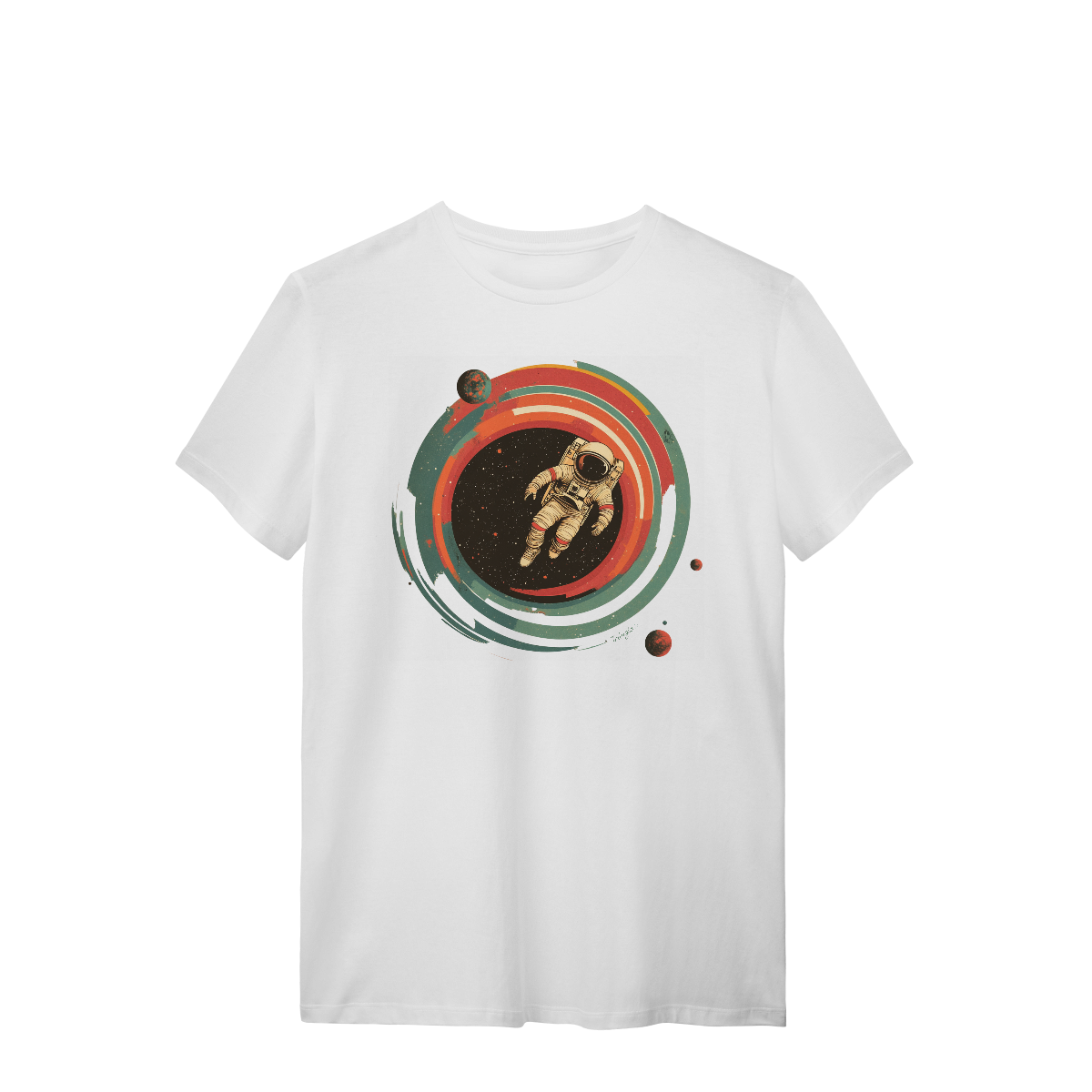 A nossa Camiseta Astronauta, confeccionada em 100% algodão, traz toque macio, leve e confortável. Sua estampa frontal vibrante de um astronauta flutuando pelo universo, com cores retrô, combina um design artístico e cheio de personalidade à uma atmosfera cósmica.
