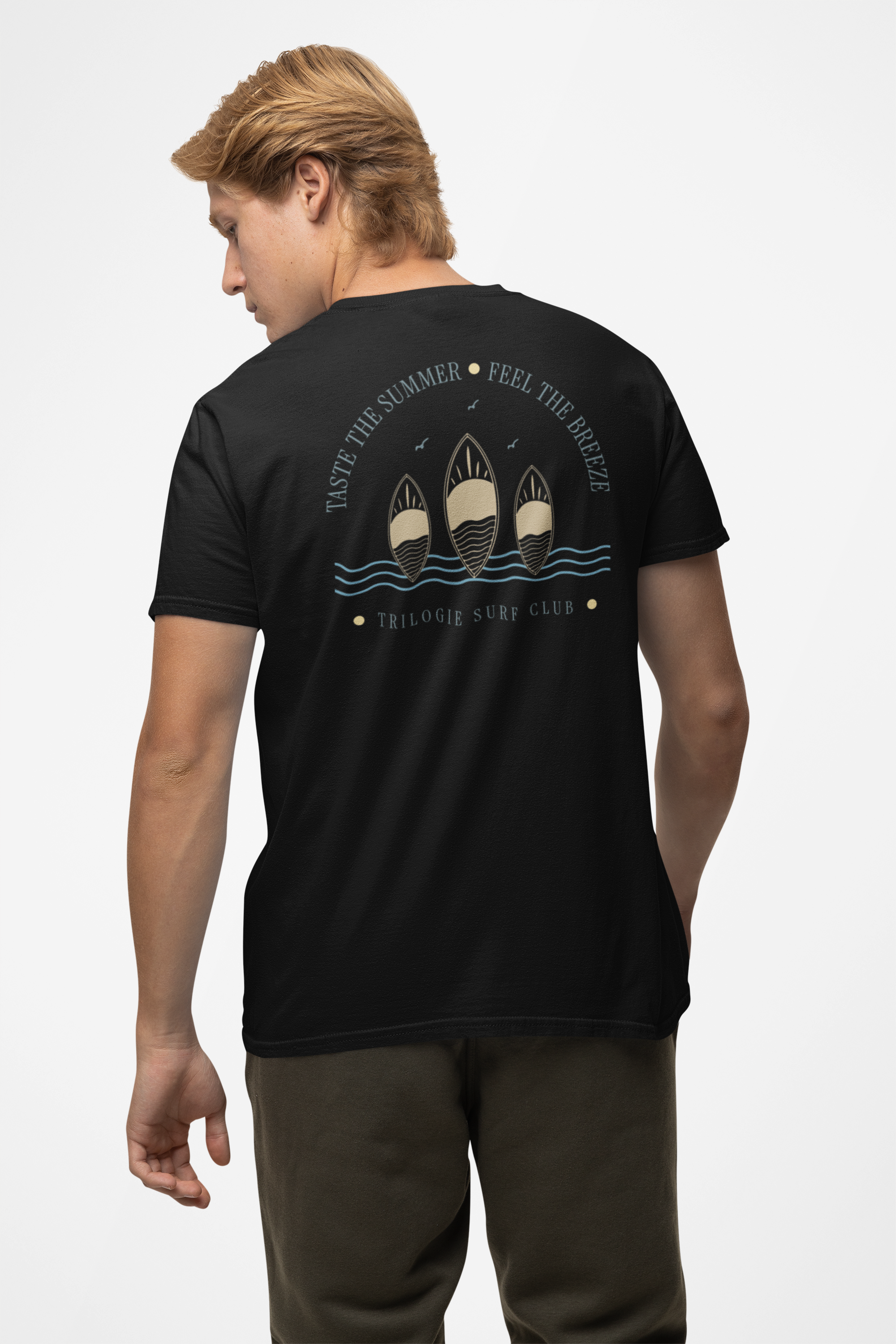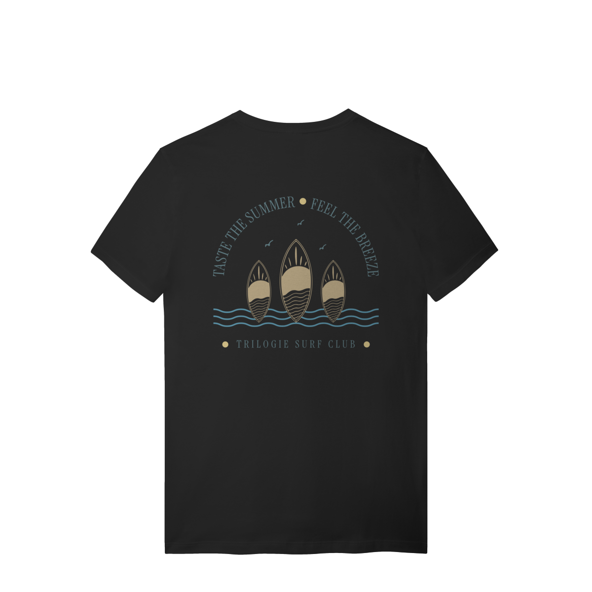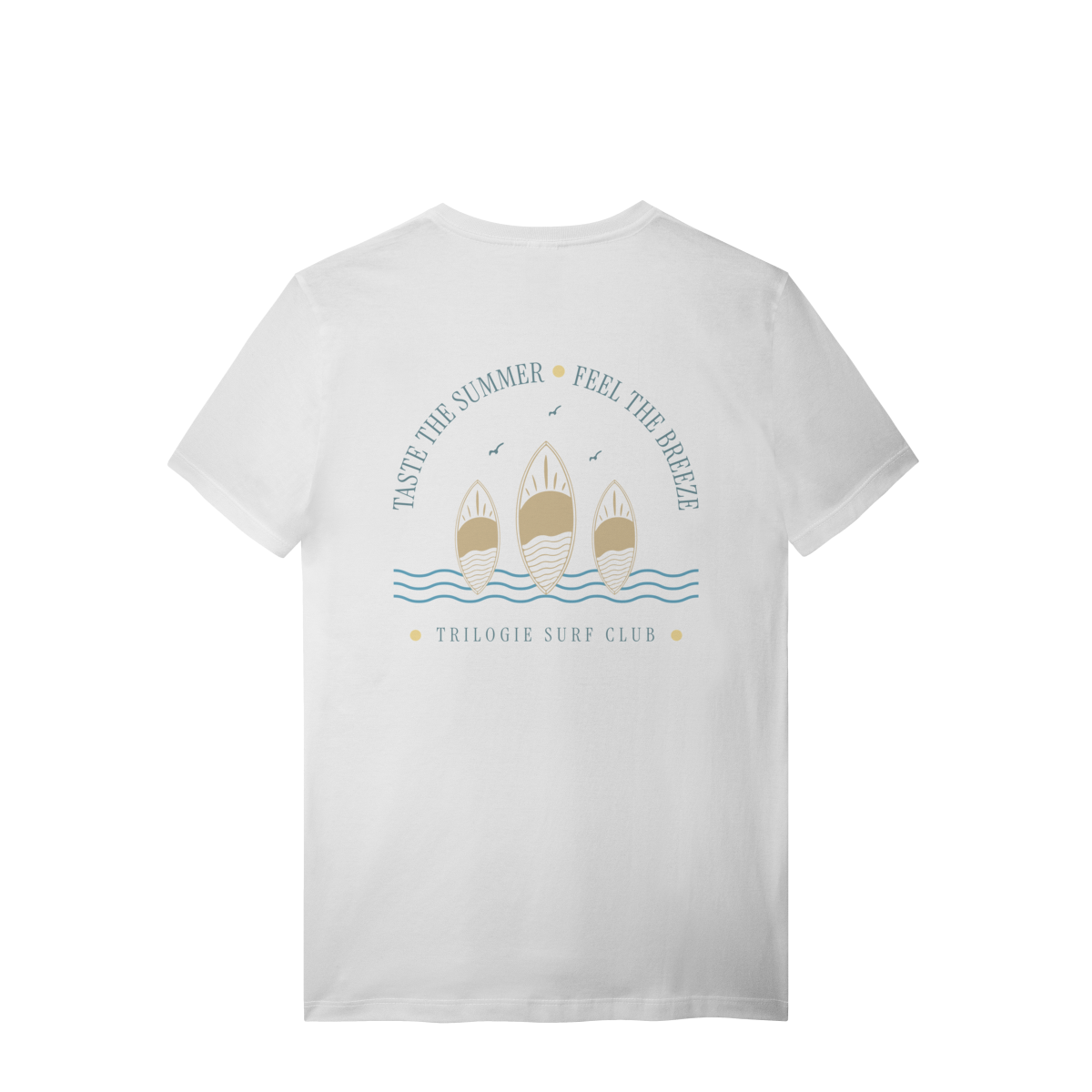 Celebrando a alma do verão com leveza e estilo, a peça conta com uma arte exclusiva nas costas, inspirada no lifestyle praiano, que combina pranchas de surf, ondas e uma mensagem “Taste the Summer • Feel the Breeze”. Na frente, escrita minimalista de Trilogie Surf Club.